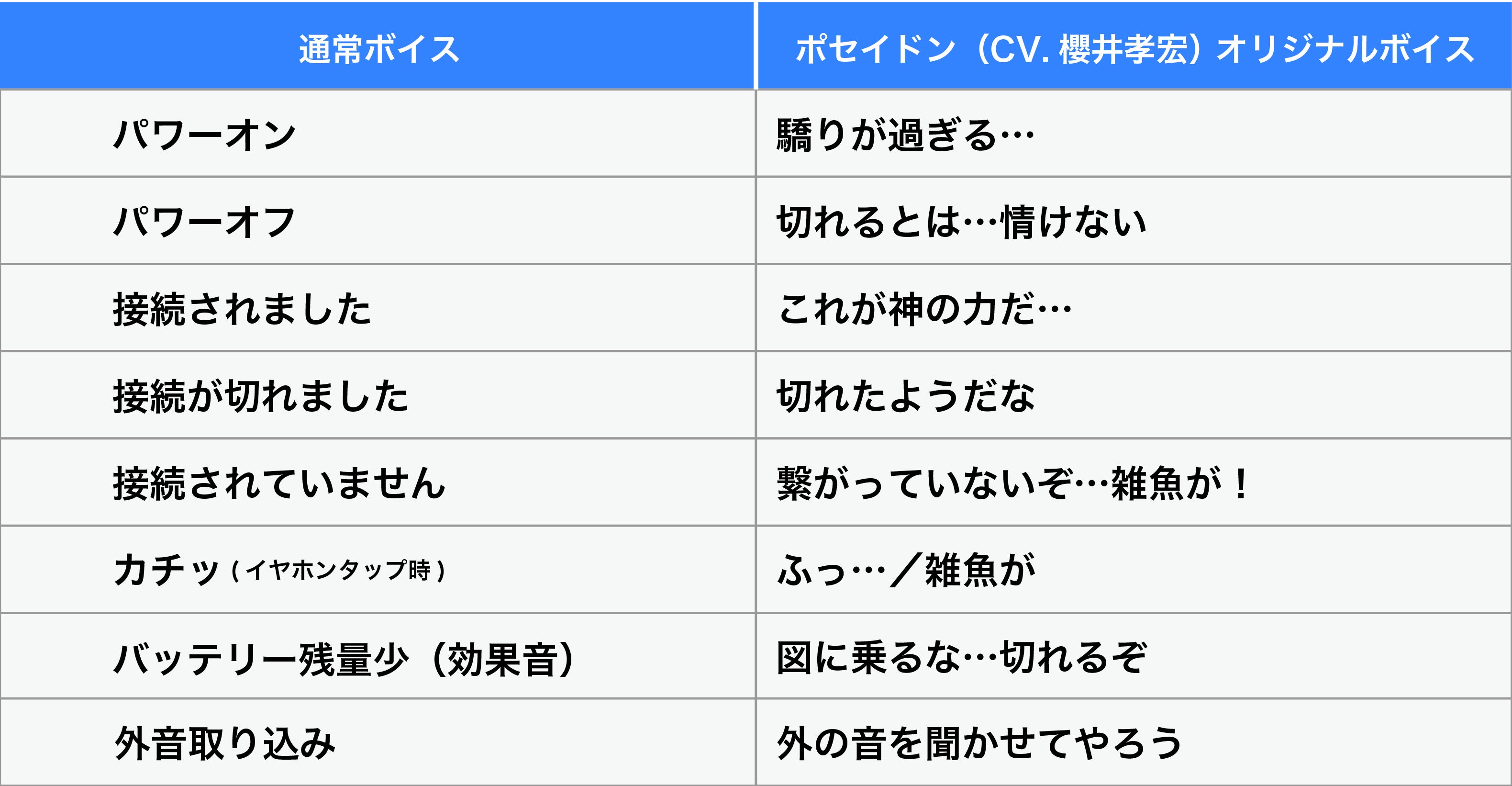 本コラボレーションにあたり、「ポセイドン(CV.櫻井孝宏)」と「アダム(CV.斉藤壮馬)」の録り下ろし音声を搭載しています。「パワーオン」「パワーオフ」などの操作音の他に、シークレットボイスを搭載しています。