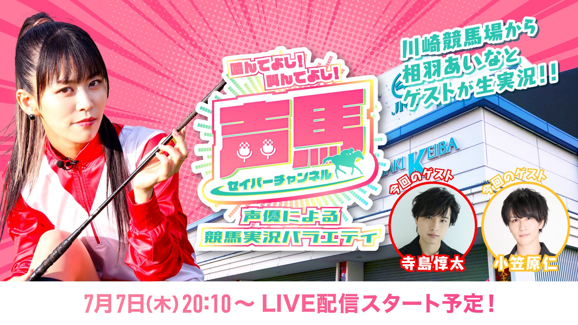 ‘声馬チャンネル実行委員会’は声優による川崎競馬実況バラエティ番組『声馬チャンネル(セイバーチャンネル)@川崎競馬場』の第8回ライブ配信のゲストに寺島惇太さんと小笠原仁さんをお迎えすることが決定したことをお知らせ致します。