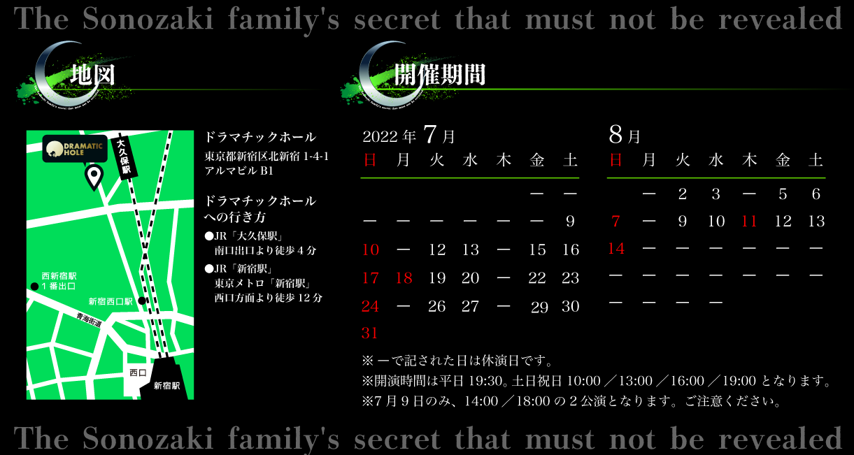 日程 : 2022年7月9日(土)から8月14日(日)まで ※7月9日のみ14:00、18:00の2公演。全て開演時間