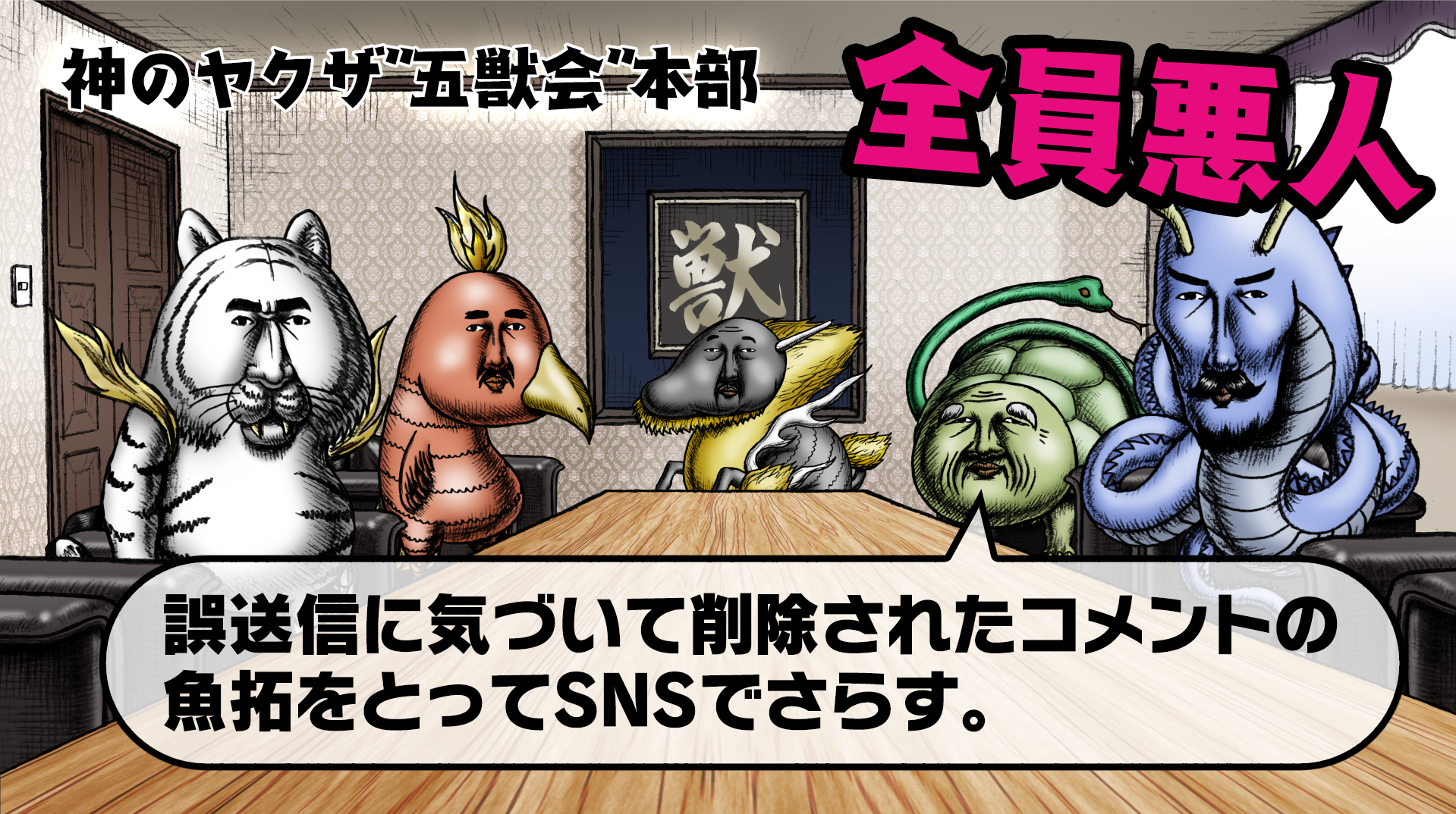 任侠道を極め、神となった獣たち、五獣。 彼らの集まりである五獣会、そこの幹部定例会が開かれていた。そんな彼らには近年、目の上のたん瘤となっている「もののけ組」という存在がいた。彼らは定例会のついでに、対応策について話し始める。会議の中で、彼らが妖怪と間違われているという情報も出てきて……。 果たして彼らは、自身が妖怪に間違われるというこの不可解な現象を科学的に解明しようと話し出す。
