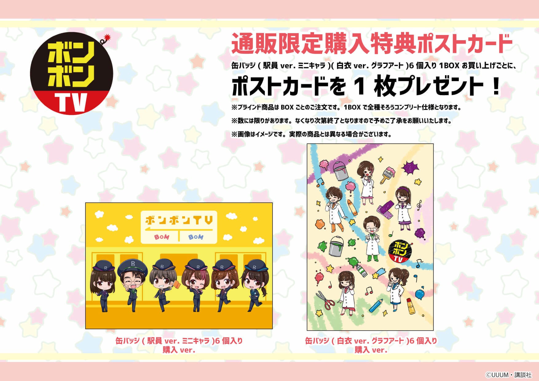また、通販では駅員ver.ミニキャラ、白衣ver.グラフアートの缶バッジ6個入りを1BOXお買い上げごとに、対象のイラストのポストカードを1枚プレゼント!