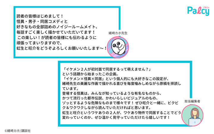 『ノイジールームメイト 〜家ナシになったのでイケメンと怪異つき物件で同居始めました〜』は少女・女性マンガアプリPalcyにて連載され、毎週木曜日に更新予定。