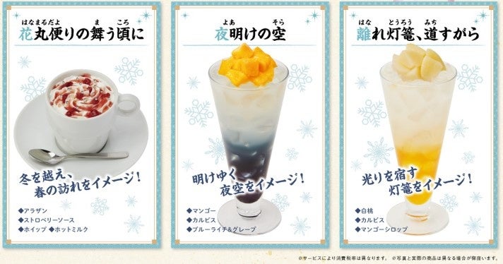 コラボドリンクのラインナップは、特『刀剣乱舞-花丸-』~雪ノ巻~のオープニングテーマ曲「花丸便りの舞う頃に」、エンディングテーマ曲「夜明けの空」、限定新エンディングテーマ曲「離れ灯篭、道すがら」をテーマにした3種です。