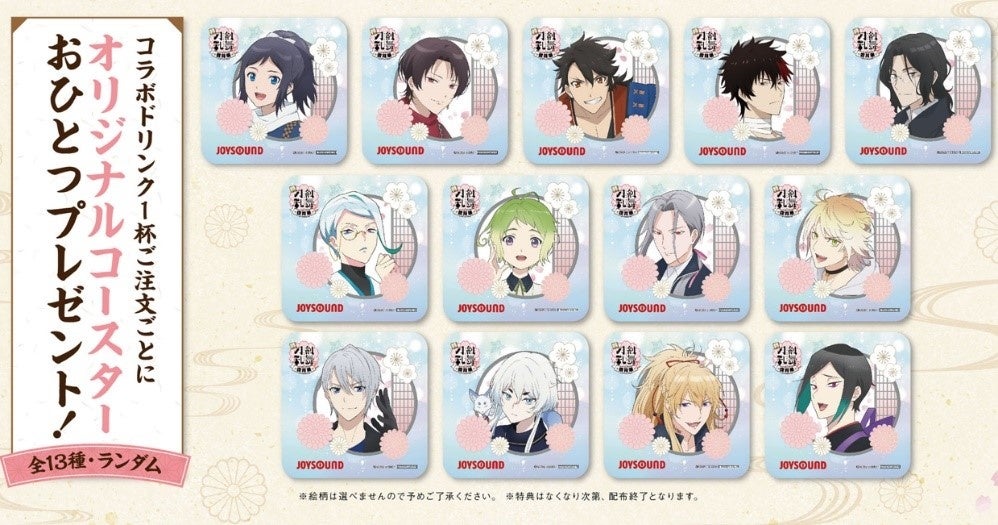 注文特典として、コラボドリンク1品ご注文につき、オリジナルコースター全13種の中からランダムで1枚プレゼント!