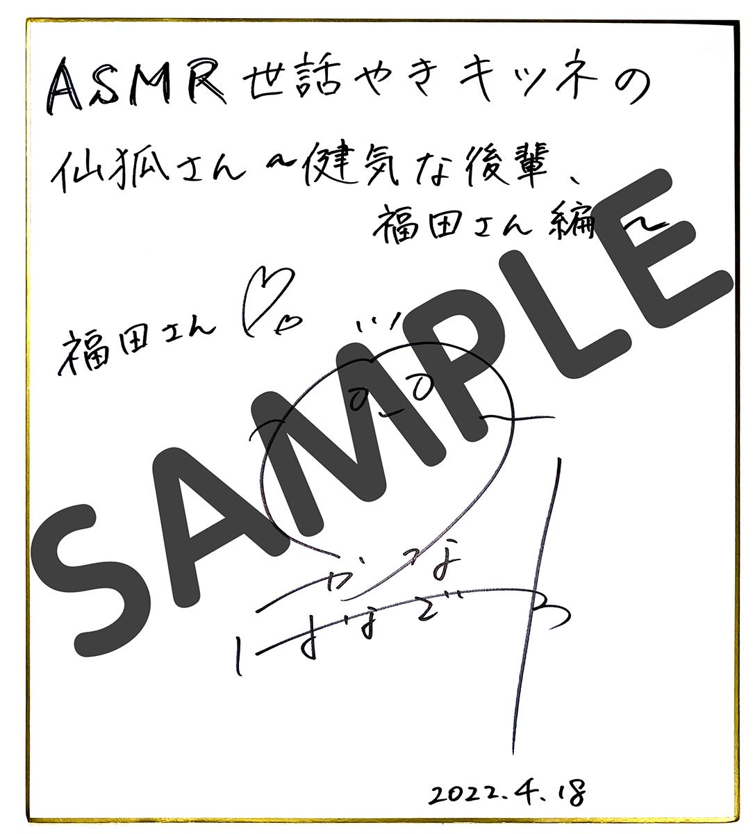 対象期間中に『ASMR世話やきキツネの仙狐さん ~健気な後輩、福田さん編~』をご購入いただき、プラットフォーム内のプレゼントキャンペーンページにてエントリーされたお客様の中から、抽選で2名様に「福田さん役 花澤香菜さんの直筆サイン色紙」をプレゼントいたします。