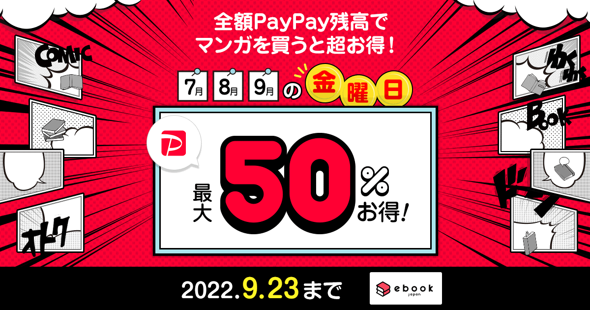 今回の「7・8・9月の金曜は全額PayPay残高決済でお得キャンペーン」と組み合わせることで、期間中の金曜日に「PayPay残高」で電子書籍を購入すると、誰でも最大30%、Yahoo!プレミアム会員であれば最大40%、ソフトバンクもしくはワイモバイルスマホユーザーは最大50%お得になります。詳細はキャンペーンページをご確認ください。