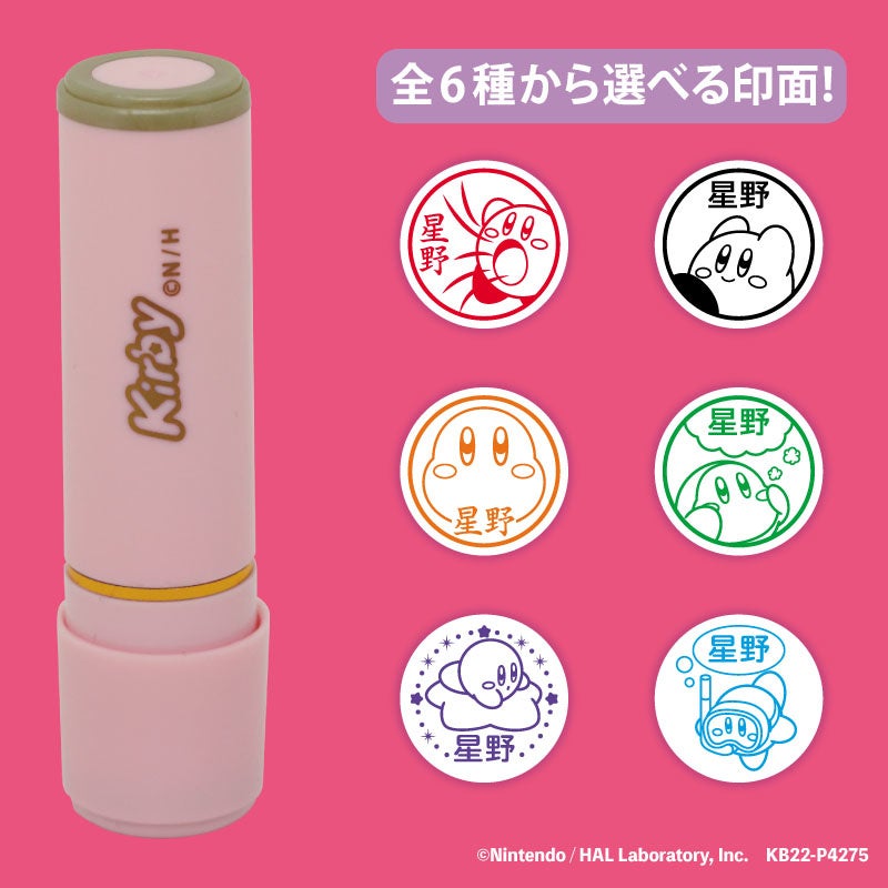 おなじみシヤチハタネーム9の印面デザインに、カービィたちのイラストが入った商品です。ご希望の文字(3文字以内)に加え、デザイン6種・書体3種・インキ色6種をお好みで組み合わせることができます。
