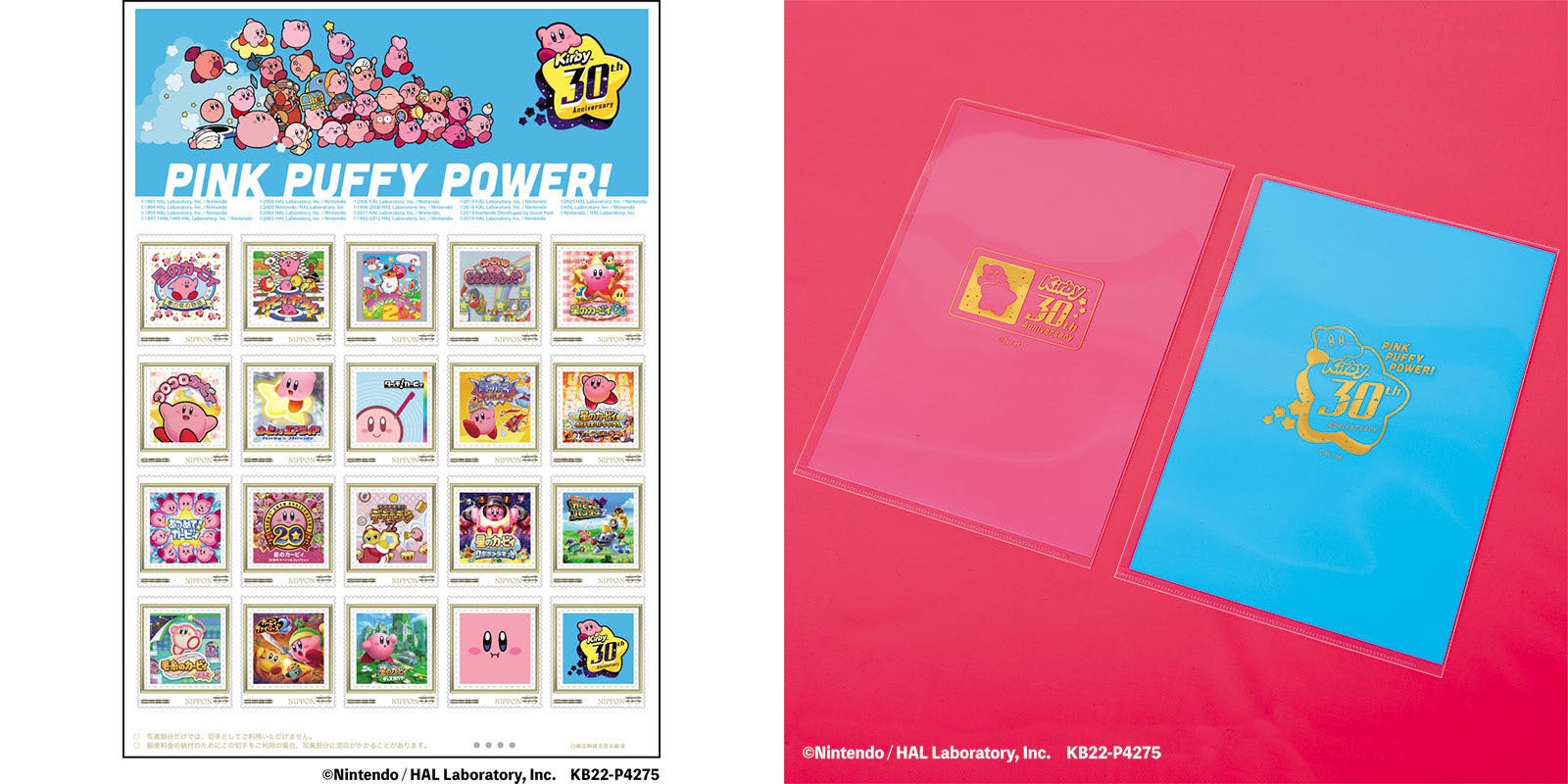 星のカービィ30周年を記念したコレクションアイテム。30年間に発売された全35タイトルのパッケージ&ビジュアルを、「フレーム切手 ピンク」「フレーム切手 ブルー」の2枚に網羅しました。箔押しを施した、透明度の高い特製クリアファイルも付属します。