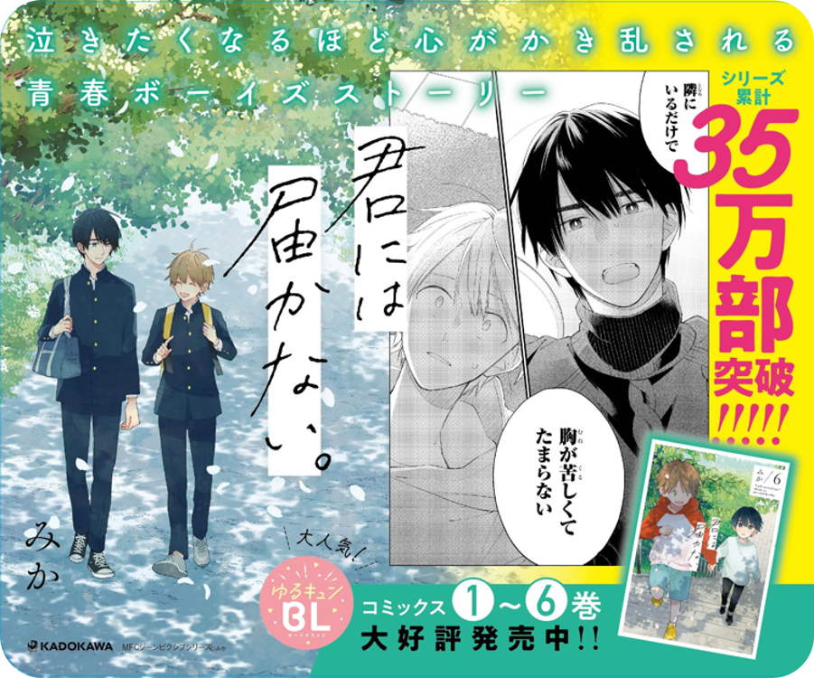 無料WEBマンガサイト『ジーンピクシブ』にて大人気連載中の『君には届かない。』(著:みか)の最新6巻が6月27日(月)に発売。さらに22年1月に公開されたゆるキュンBLのCMを『君には届かない。』仕様に再編成された動画も公開!また、新刊発売を記念して、交通広告も掲出いたします。