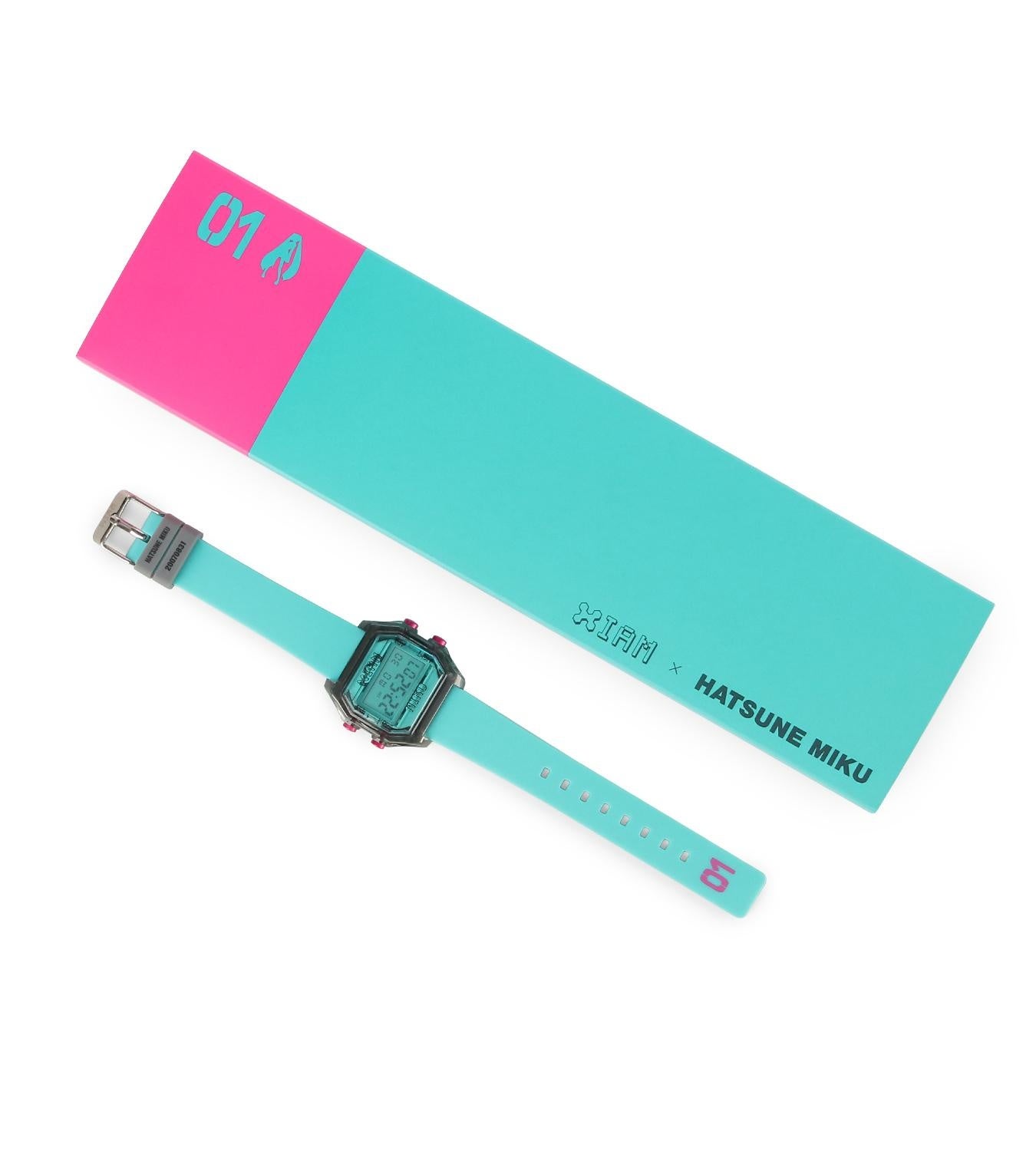 ケース下部にはI AMのロゴ風に「MIKU」の文字をレイアウトし、ベルトの先端には初音ミクの肩のシリーズナンバーをあしらっています。