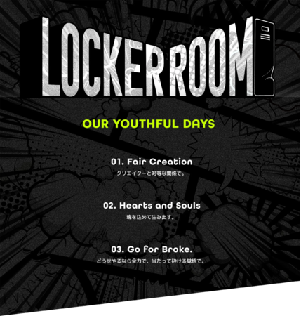 縦読みマンガとして知られるデジタルコミック「WEBTOON」(ウェブトゥーン)専門の企画・制作・編集スタジオ。「LOCKER ROOM」という社名には、”部室や全国大会の控室” という想いを込めています。これからの世代が、夜も眠れないくらい熱狂できるような作品を生み出すために、まずは私たちが熱狂し、泥まみれになりながら、ものづくりをしています。