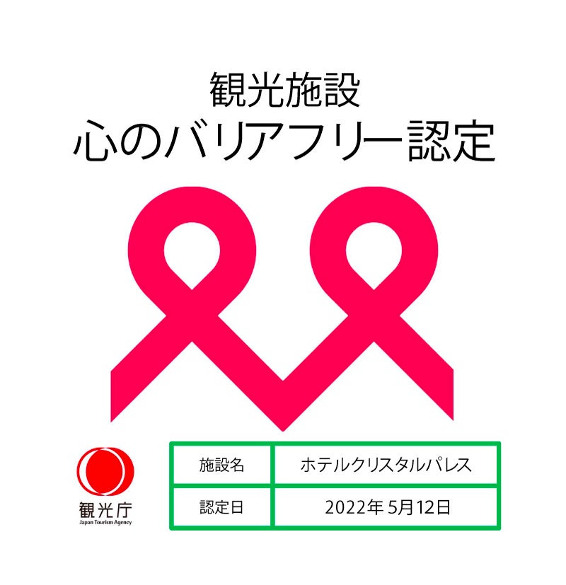 ホテルクリスタルパレスはバリアフリー対応や情報発信に積極的に取り組む姿勢のある観光施設を対象とした「観光施設における心のバリアフリー認定制度」の認定を得た宿泊施設です。ご高齢の方や障害のある方がより安全で快適な旅行をするための環境整備に努めております。