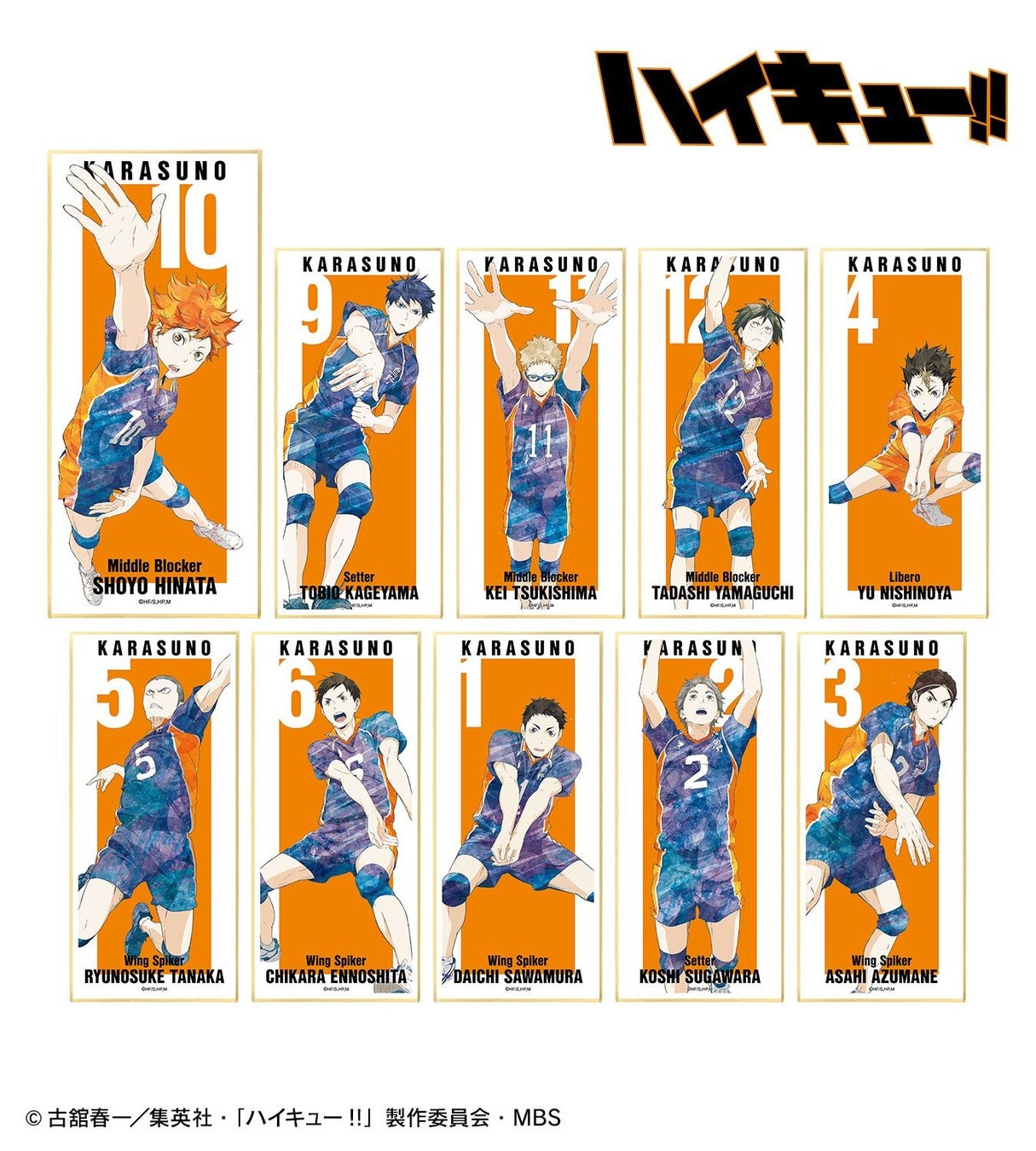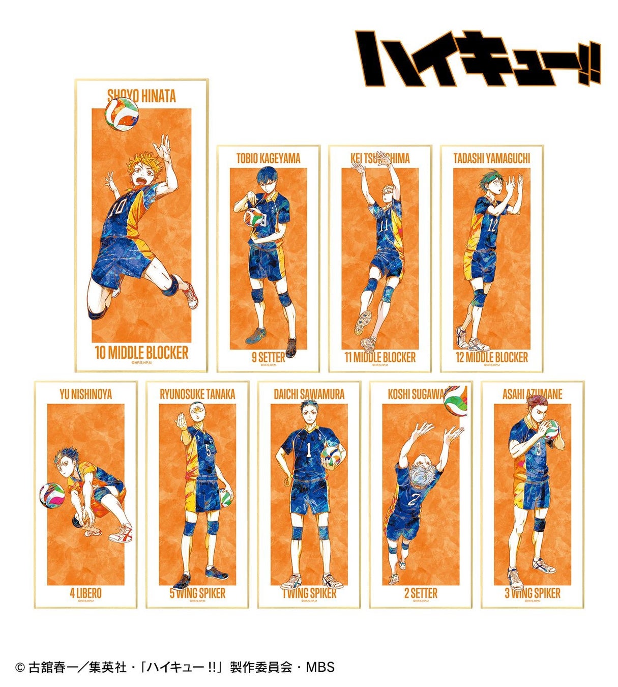 日向翔陽、影山飛雄、月島蛍、山口忠、西谷夕、田中龍之介、縁下力、澤村大地、菅原孝支、東峰旭を新たなタッチで魅力的に表現し、スタンド付きの色紙に仕上げました。