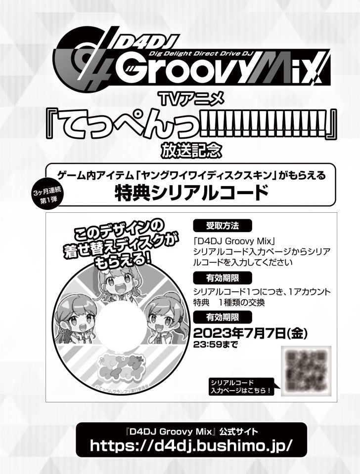 大好評の月ブシシリアルには、「ブシロード15周年記念ライブ」に申し込める最速先行抽選応募申込シリアルと、『D4DJ Groovy Mix』アプリ内でヤングワイワイの「着せ替えディスクスキン」がもらえるシリアルを封入しています。