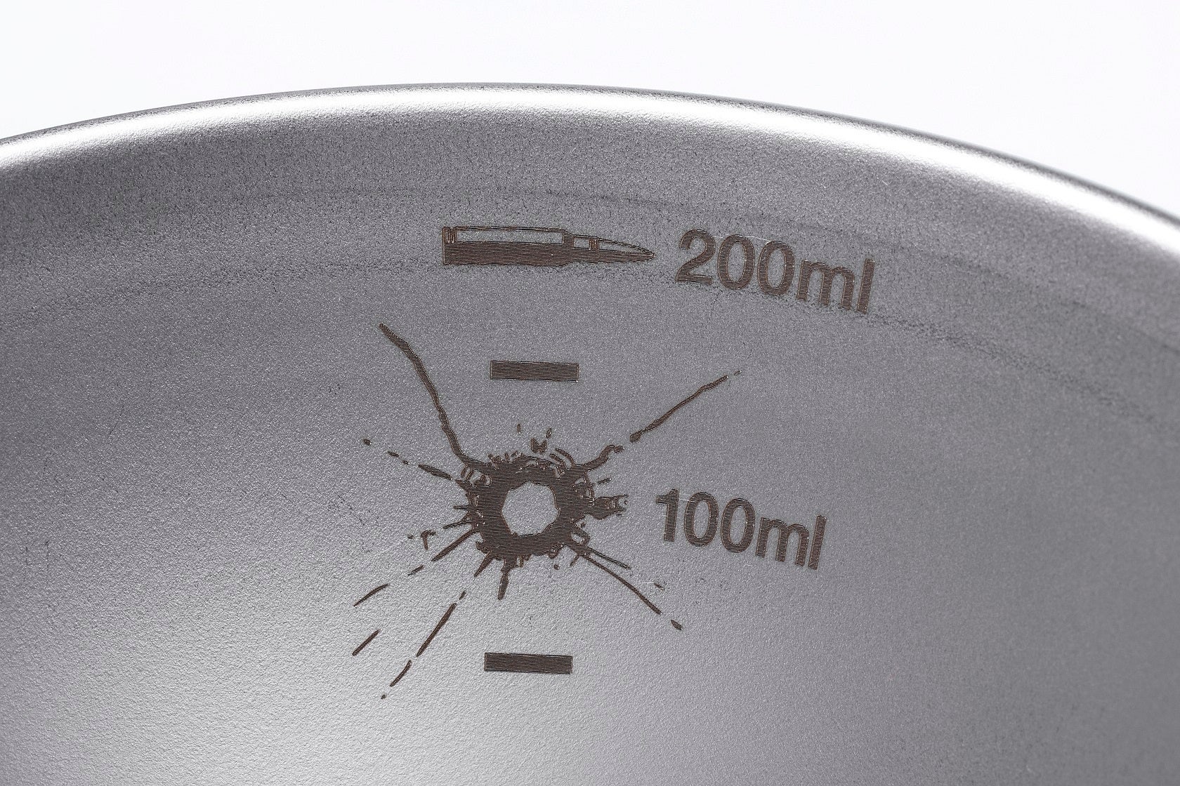すべてカップの内側には計量に便利な目盛りが入ります。ライフル弾の弾丸と狙撃痕をデザインした、ユーモアあふれるディテールです。