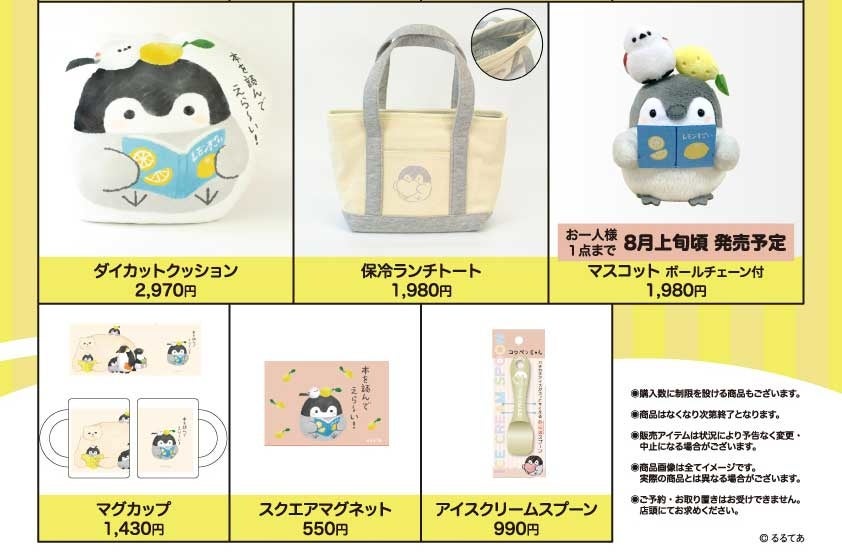 小説『檸檬』(著:梶井基次郎)に当時京都三条通麩屋町に実在した丸善が登場することから、「檸檬」と縁がある丸善ジュンク堂書店。「コウペンちゃんBOOK STORE」のために描き下ろされたイラストでは、コウペンちゃんが頭にレモンをのせていたり、「レモンすごい」「宇宙のレモン」という本を読んでいたり、「檸檬」とのコラボレーションが実現しました。オリジナルグッズの販売は丸善ジュンク堂書店21店舗限定ですので、お見逃しなく!