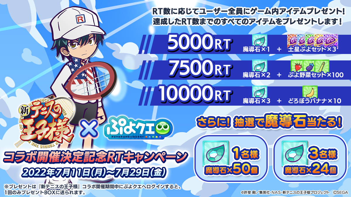 株式会社セガは、大好評配信中のパズルRPG『ぷよぷよ!!クエスト』(以下、『ぷよクエ』)において、TVアニメ『新テニスの王子様』とのコラボイベントの開催が決定したことをお知らせします。また、2022年7月30日(土)20時より「ぷよクエ公式生放送~新テニスの王子様コラボスペシャル~」を生配信いたします。コラボ詳細をお届け予定ですのでお楽しみに!