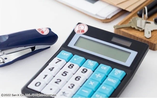 ハンコを押してお名前つけシールがつくれる耐水性の丸型シール「ぺたまる」(別売)を使えば、すみっコぐらしのキャラクターを自分の持ちものの「しるし」とすることもできます。
