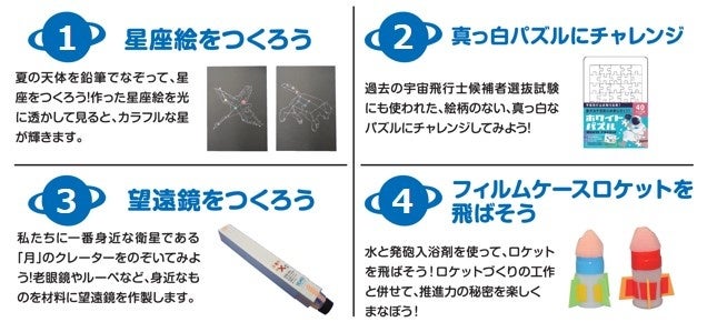 | 8月15日 | ④フィルムケースロケットを飛ばそう | ①星座絵をつくろう | ②真っ白パズルにチャレンジ※宇宙兄さんズ来館 | |