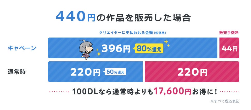 従来は最大80%のお支払いであるのに対し、本キャンペーンでは販売する作品の価格を問わず売り上げの90%をお支払いし、クリエイターさんの活動を応援いたします。
