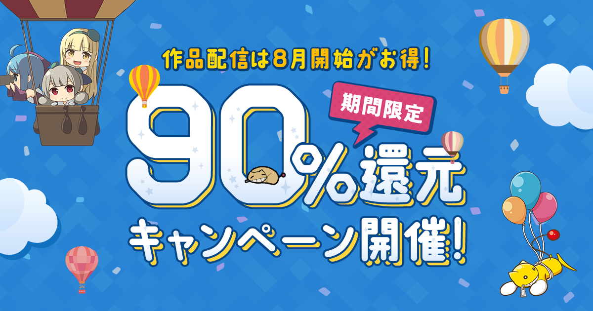 二次元コンテンツのダウンロード販売サービス『DLsite』(株式会社エイシス、所在地:東京都千代田区、代表取締役:藤井純)は、8月1日から8月31日にかけて、同人活動を行うクリエイターの応援を目的に、対象作品の販売手数料を一律に引き下げ、売り上げの90%をクリエイターにお支払いする「作品配信は8月開始がお得! 同人マンガ・期間限定90%還元キャンペーン」を実施します。