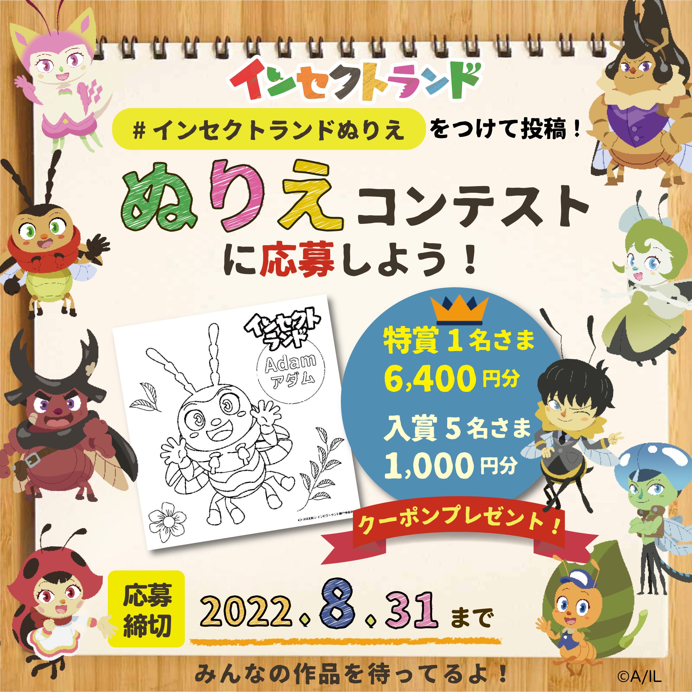 楽しんだぬりえを写真に撮って、「#インセクトランドぬりえ」のハッシュタグでSNS(Twitter、Instagram)にアップしてください。入賞者には、公式オンラインショップ「INSECT MARKET」のお買い物クーポンをプレゼント!