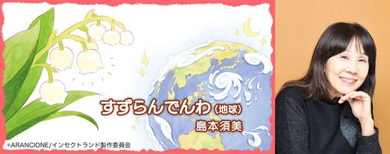 原作INSECT LAND「シャルロットとすずらんでんわ」でも描かれていた地球の声が聴こえるすずらんのでんわ。大切なことを昆虫たちに教えてくれる重要な役どころを演じるのは、「風の谷のナウシカ」のナウシカ役、「それいけ!アンパンマン」のしょくぱんまん役などで知られるベテラン声優・島本須美さん。優しく、地球上の生きもの達を包み込むような温かな声は必見です。