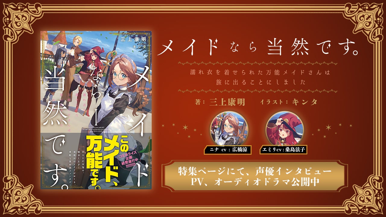 7/15(金)新刊ノベル「メイドなら当然です。濡れ衣を着せられた万能メイドさんは旅に出ることにしました」第1巻発売記念CM&オーディオドラマ&キャストへの独占インタビューを本日より公開!
