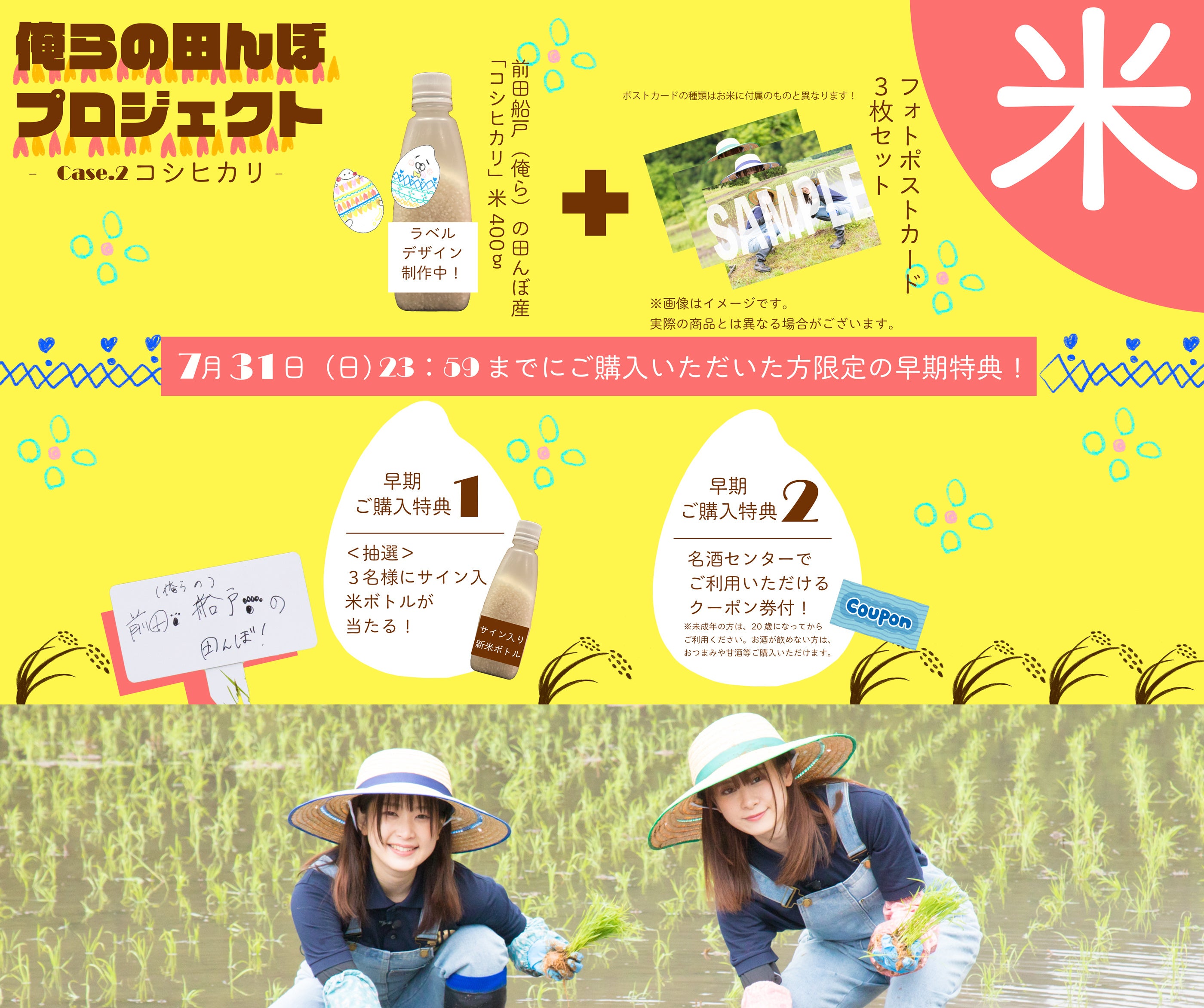 7月31日23:59までのお酒ご予約でもれなく前田船戸(俺ら)の田んぼ産「コシヒカリ」米(約1合)付!お酒発送までに届くメッセージポストカード付やサインが当たる早期購入特典満載です。