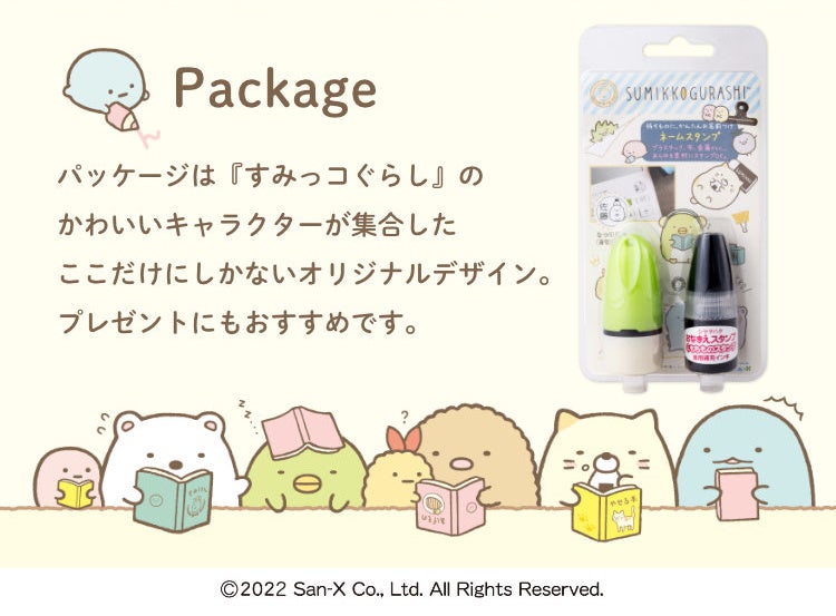 すみっコぐらしファンにはたまらない、とってもかわいい専用パッケージに入れてお届けします(10cc入り補充インク1本つき。1回の補充で500回程度のスタンプができます)。