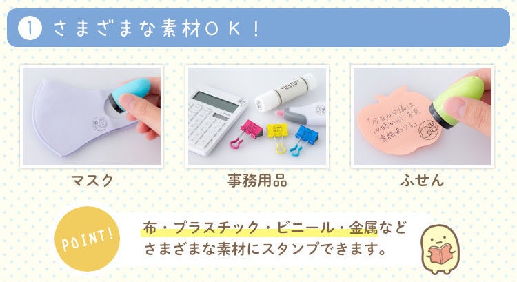 はんこの枠の中でもすみっこにいるキャラクターはどれも愛らしいものばかり。ポン!と自分のもちものに押すだけで、いつでもどこでも大好きなすみっコと一緒にいられる「すみっコぐらし もちものスタンプ」。はんこというと事務的でお堅いイメージがありますが、 わたしたちはこれからも好きな人にはたまらないユニークな企画をつうじて、 ハンコに愛着を持つ人を増やしてまいります。