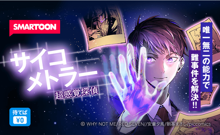 毎週木曜日に1話ずつ更新予定で、プロローグ〜3話までは無料で読むことができ、4話からは「待てば¥0®︎」で読むことができます。是非、フルカラー・縦スクロールマンガSMARTOONになって連載が始まる『サイコメトラー 超感覚探偵』をピッコマでお楽しみください。