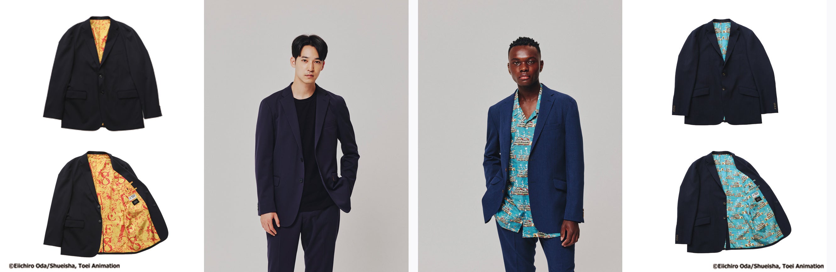 ONE PIECE SHIRTSのグラフィックデザインをジャケットの裏地にカスタマイズできる新しいプロダクトです。お好みのジャケット素材(表生地)に、ONE PIECE SHIRTSの裏地をカスタムすることが可能です。ファッションシーン、ビジネスシーンにおいて、ジャケットを着用される方はもちろん、さりげなくONE PIECE SHIRTSデザインを身に纏いたい方など、ONE PIECE SHIRTSの世界観を感じることのできる一着です。