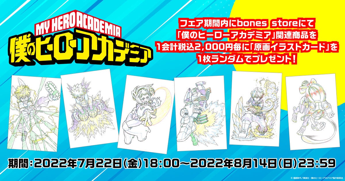 公式通販サイト「bones store」にて2022年7月22日~8月14日まで開催される「僕のヒーローアカデミア bones storeフェア 2022 SUMMER」では期間中、『僕のヒーローアカデミア』関連のキャラクターグッズをご購入2,000円(税込)毎に、特典「描き下ろし原画イラストカード(全6種)」をランダムで1枚プレゼントいたします。