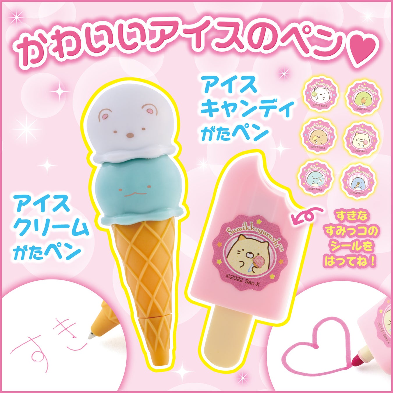 注目はアイスのかたちのペン。アイスクリームがたペンは、しろくま&とかげのようなデザインがかわいいペンです。アイスキャンディがたペンには、しろくま、ぺんぎん?、とんかつ、ねこ、とかげ、ぺんぎん(ほんもの)の6キャラクターのうち、好きなキャラクターのシールを貼ることができます。インクはどちらもきれいなピンク色です!