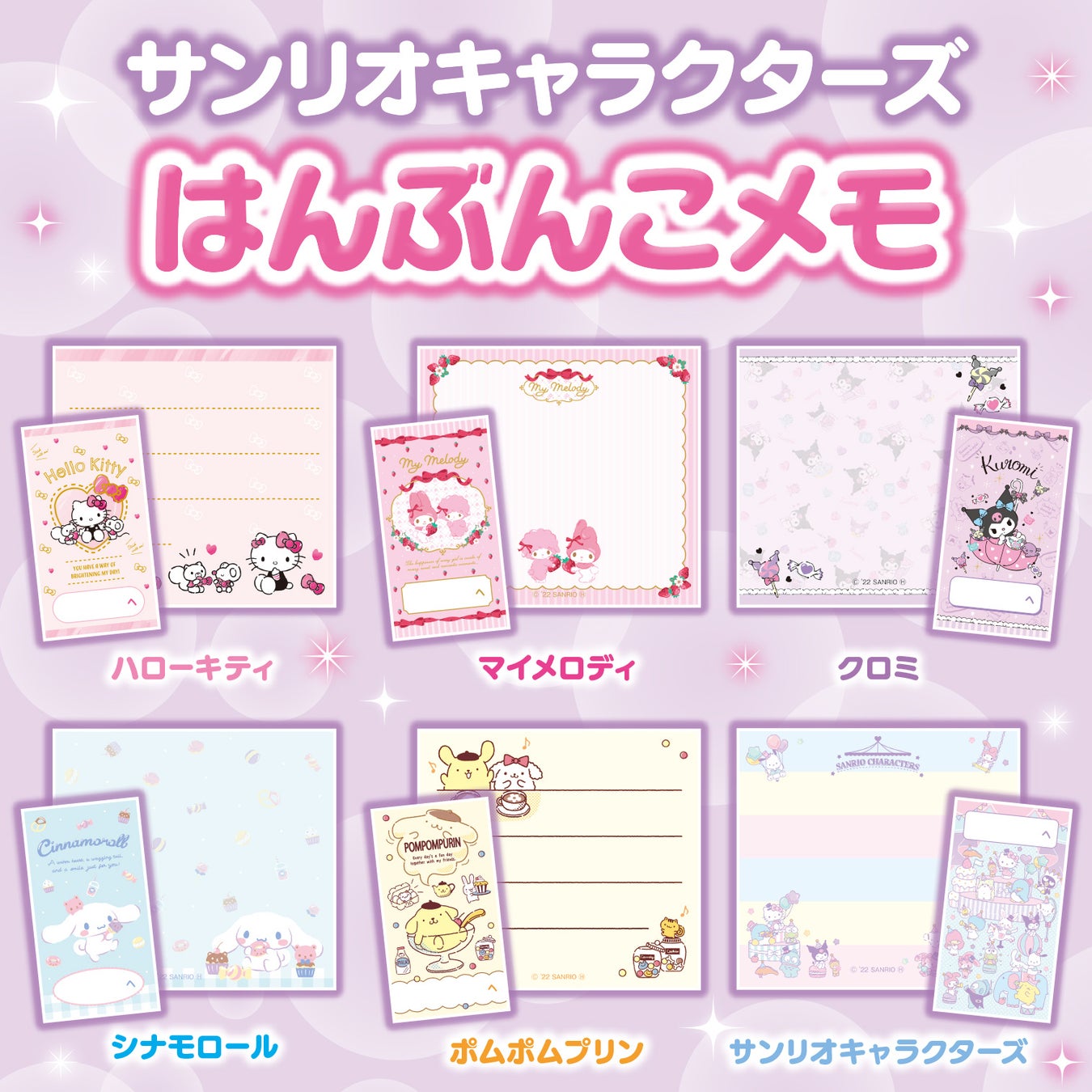 はんぶんにおるだけでとってもかわいくなる、サンリオキャラクターのメモです。キャラクターは、ハローキティ、マイメロディ、クロミ、シナモロール、ポムポムプリンに、サンリオキャラクターズと超豪華! たっぷりメッセージを書きたいときにおすすめです。