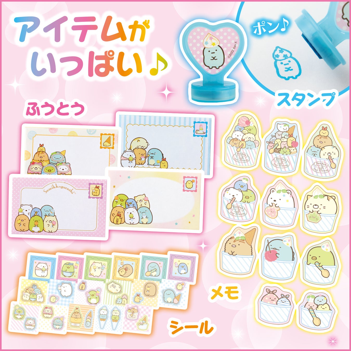 バッグを開けて組み立てると、アイスクリームがテーマのおえかき&おてがみセットがいっぱい! しろくま&とかげのアイスクリームがたペン、好きなすみっコのシールを貼れるアイスキャンディがたペン、たぴおかがかわいいスタンプ、おてがみがたっぷりかけるメモ・ふうとう・シールと、豪華アイテムがたっぷり入ったセットです。