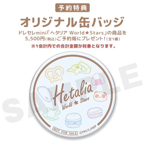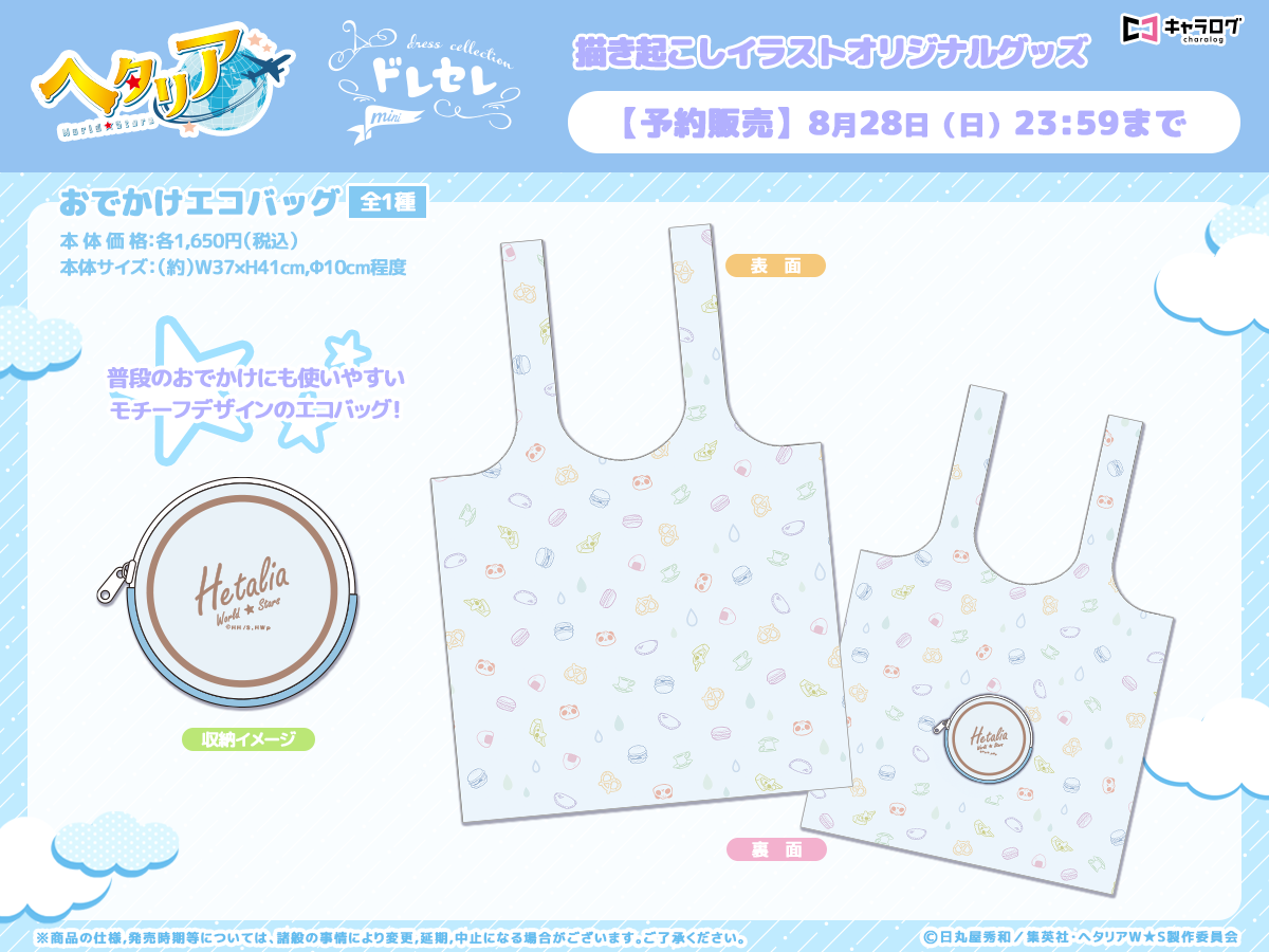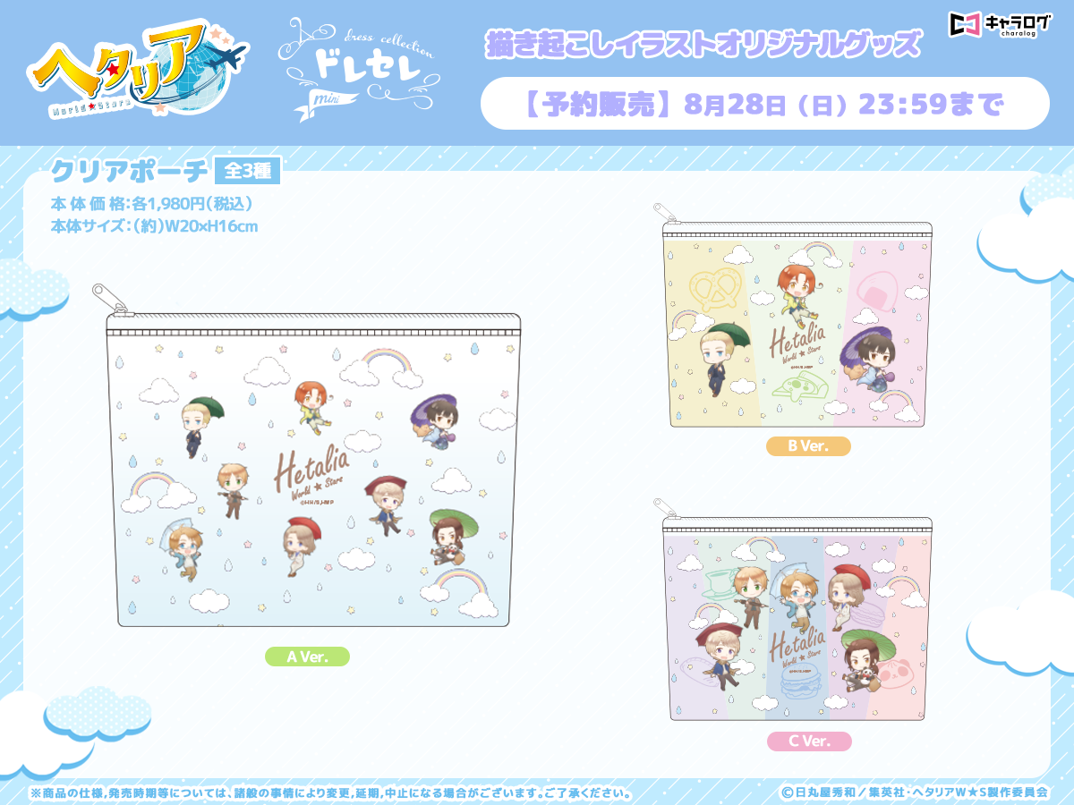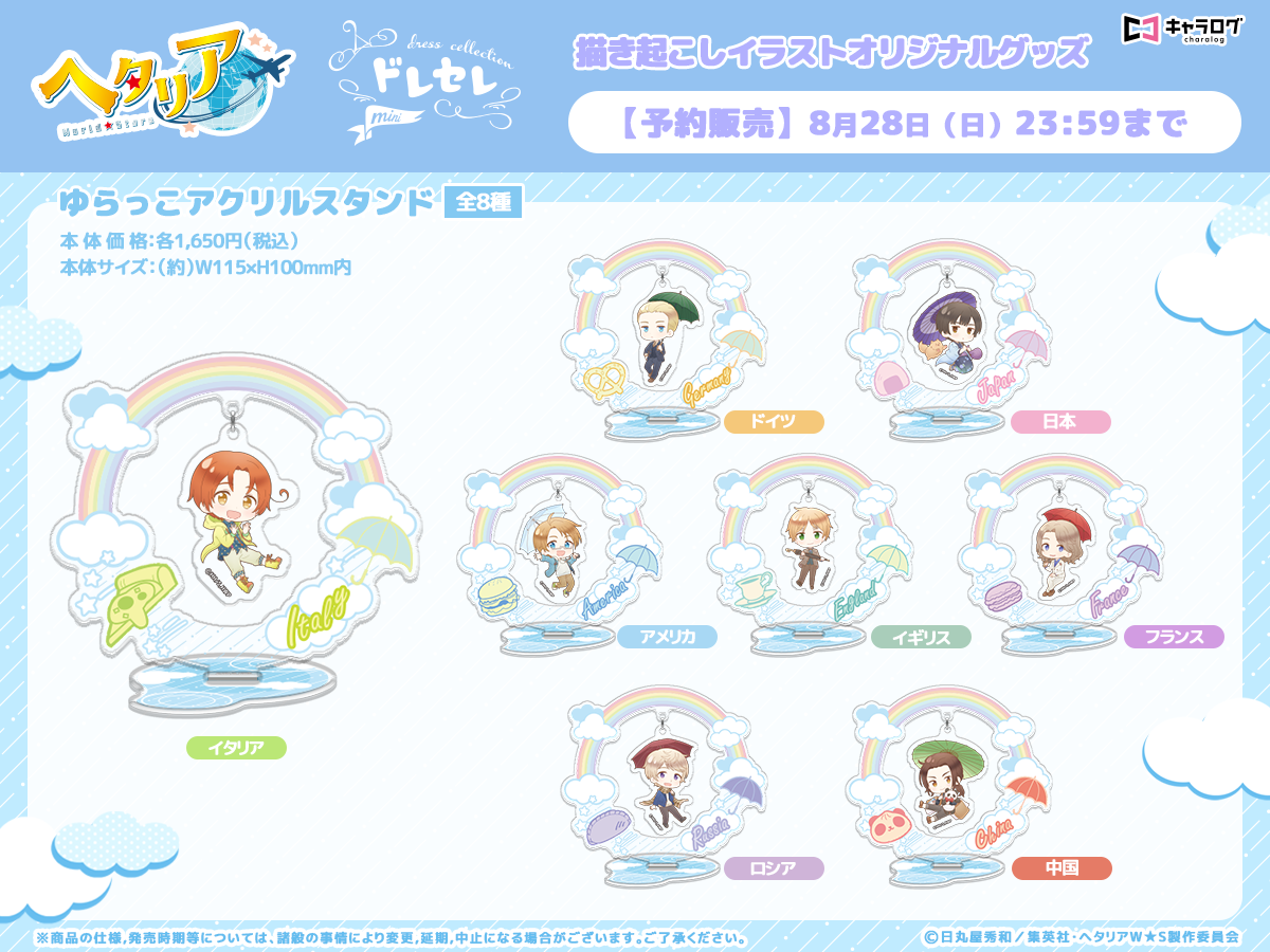 第一弾では、「ヘタリア World★Stars」の描き起こしイラストを使用したグッズを販売。株式会社ディ・テクノが運営するオンラインくじサービス「WEBくじ」にて、2021年8月に販売された下記描き下ろしイラストの衣装を、忠実に再現しました。
