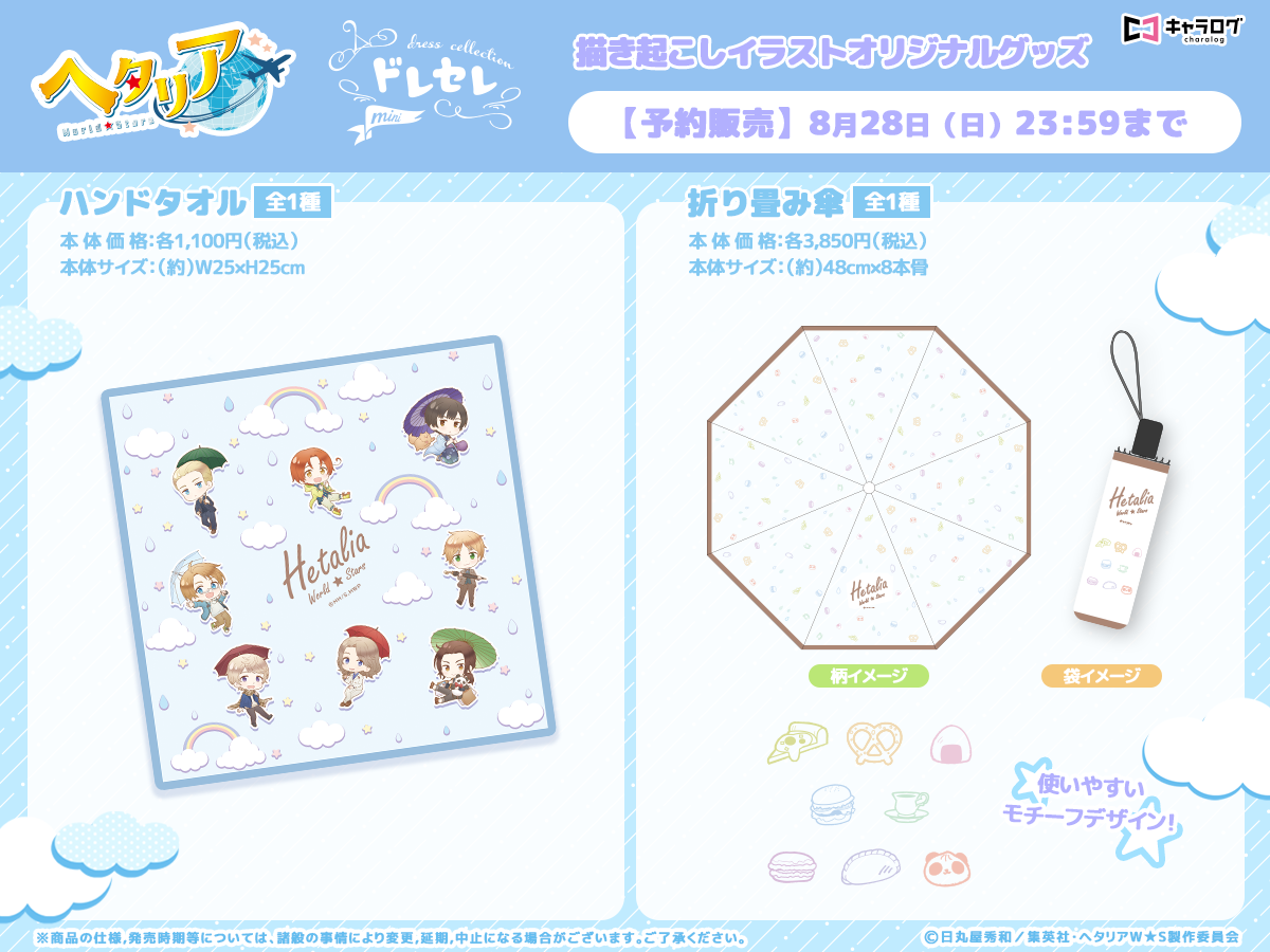 株式会社ディ・テクノ(本社:東京都中央区 代表取締役社長:市原 高明)は、2022年7月29日(金)よりアニメ「ヘタリア World★Stars」の描き起こしデフォルメイラストを使用した、オリジナルグッズの予約販売を開始いたしました。