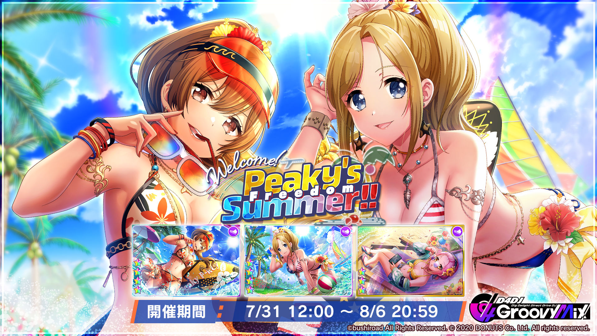 株式会社ブシロード(本社:東京都中野区、代表取締役社長:木谷高明)は、株式会社DONUTS(本社:東京都渋谷区、代表取締役:西村啓成)と共同開発のスマートフォン向けリズムゲーム「D4DJ Groovy Mix」(以下グルミク)にて、イベント&ガチャ「Welcome! Peaky’s Freedom Summer!!」を開催いたします。