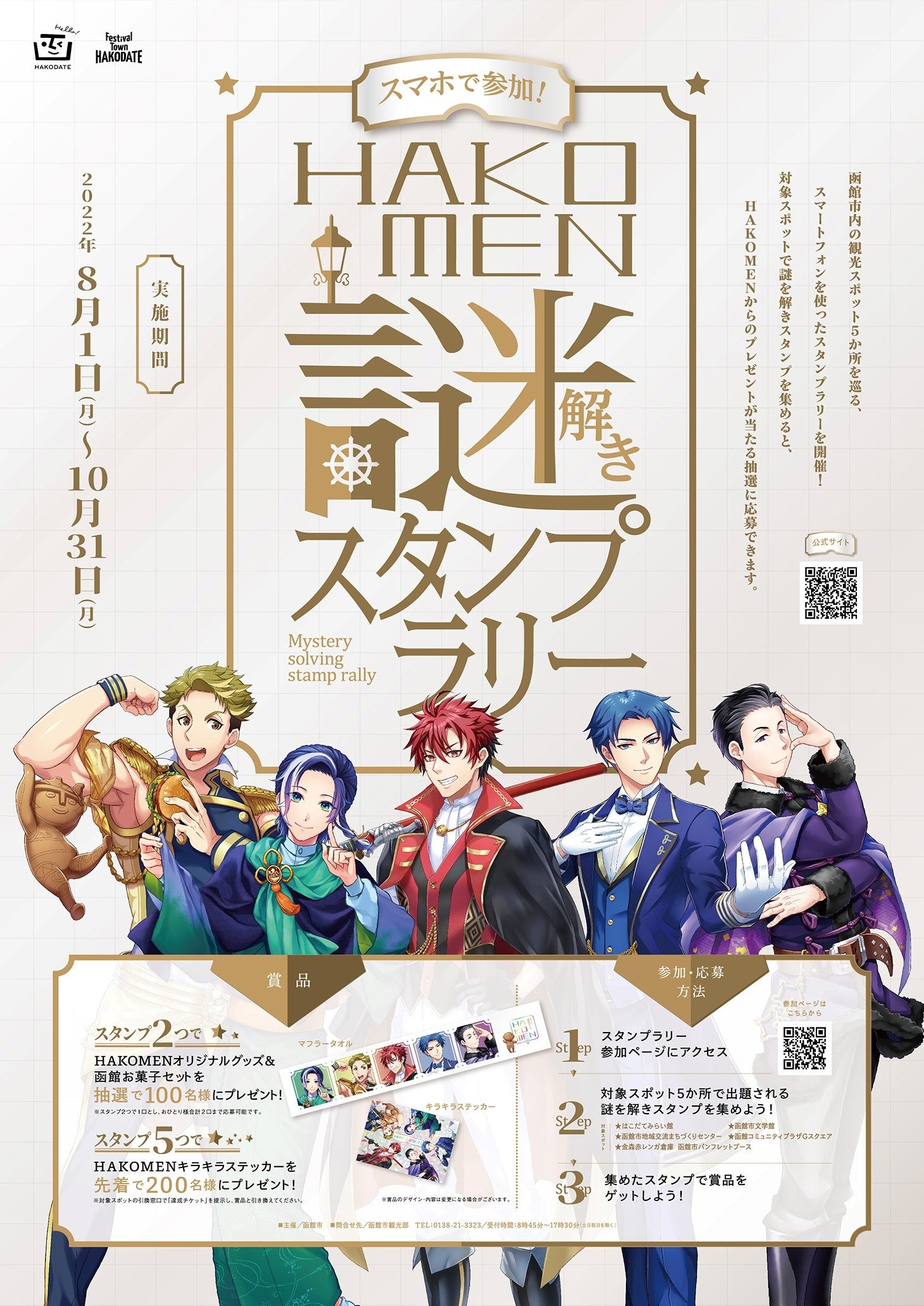 北海道函館市は、人との接触を伴わないWEBやSNS等を活用した「非接触型函館観光プロモーション」の一環として、市内の観光スポット5か所を巡る「スマホで参加!HAKOMEN謎解きスタンプラリー」を開催いたします。ご多忙中のこととは存じますが、是非本リリースをご取材いただきますようご案内申し上げます。