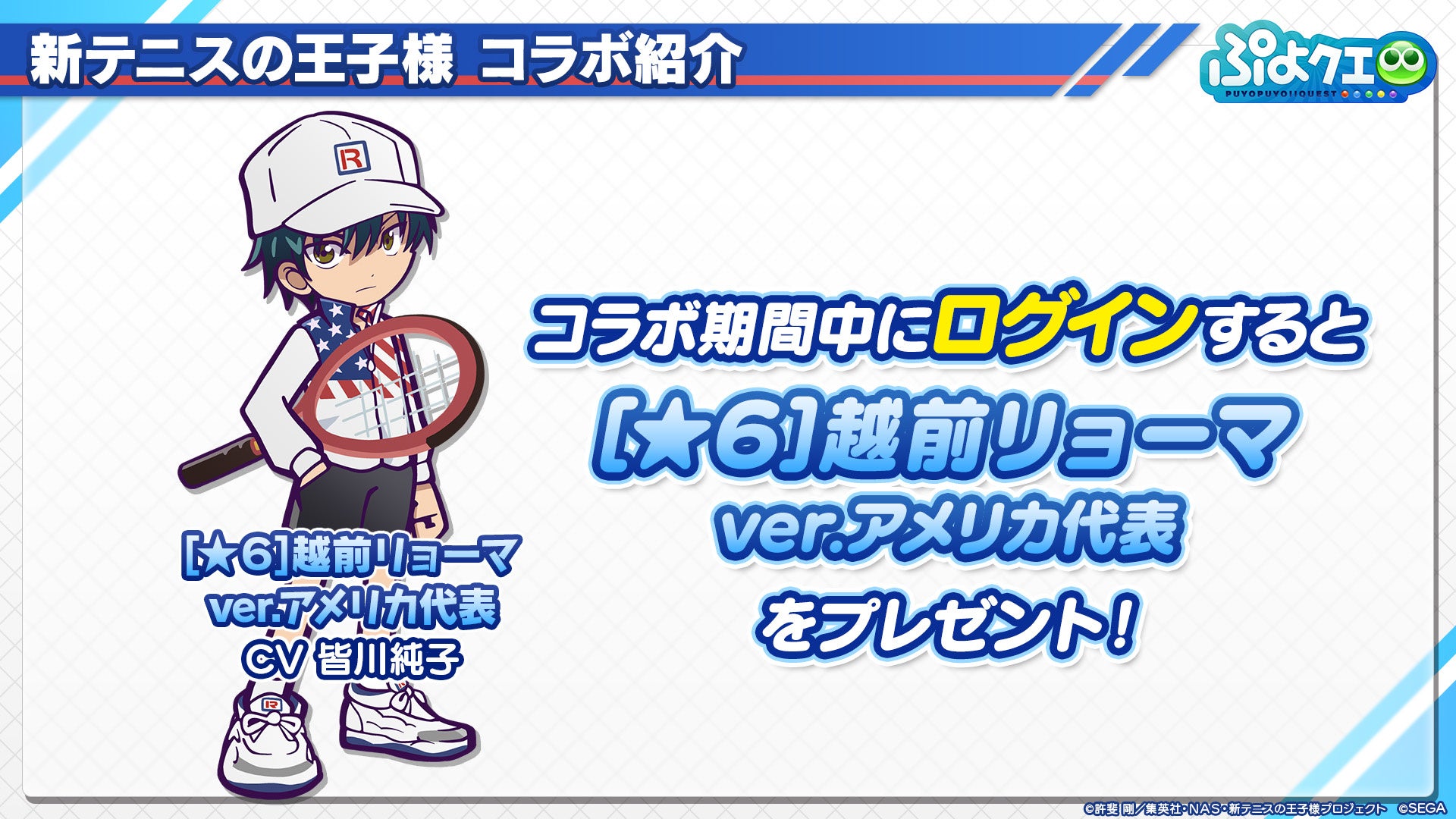 コラボ期間中に『ぷよクエ』にログインすると、「スペシャルプレゼント」として1回限定で「[★6]越前リョーマ ver.アメリカ代表」がもらえます。