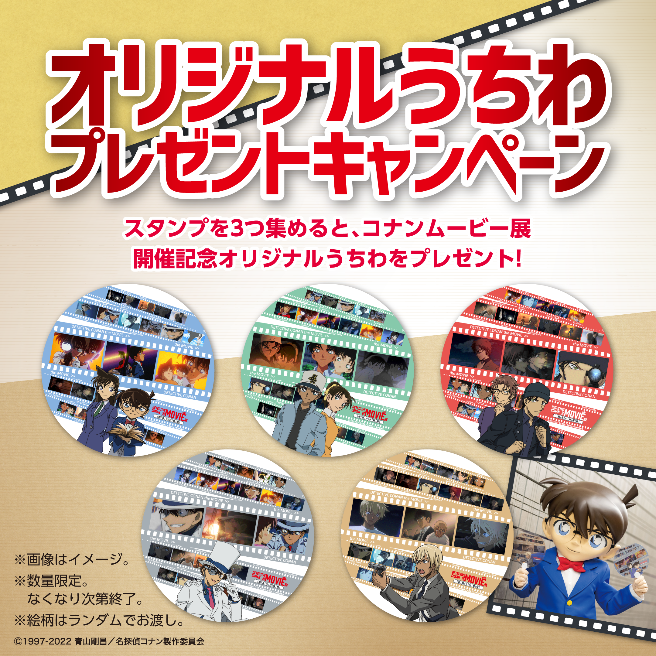会期中、コナンムービー展入口で配布されるパンフレットにスタンプを3つ集めると、「コナンムービー展開催記念オリジナルうちわ」をプレゼント!