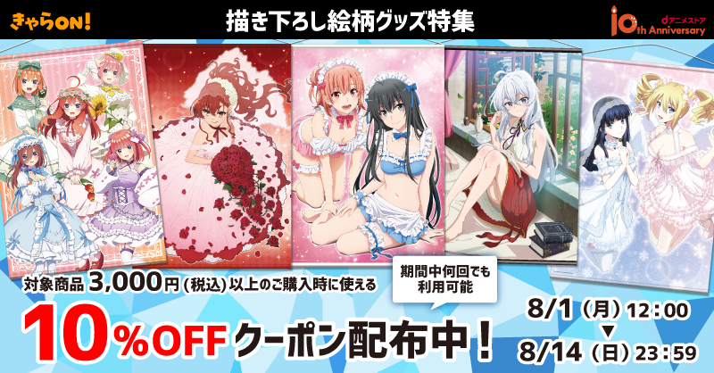 4,800作品以上のアニメが見放題(※)の「dアニメストア」( https://animestore.docomo.ne.jp/ )では、2022年8月1日~8月14日まで「【きゃらON!限定】描き下ろし絵柄グッズ対象10%OFFクーポン」を配布いたします。