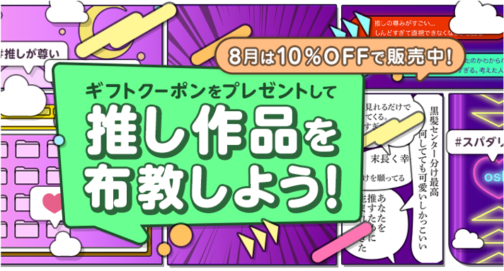 電子書籍販売サイト「ebookjapan」をヤフー株式会社と協力して運営する、株式会社イーブックイニシアティブジャパンは、LINE株式会社が運営する「LINEギフト」に2021年11月29日から新規出店し、ebookjapanサイトで利用できるギフトクーポンを販売しております。この度「推し作品布教応援キャンペーン」として、2022年8月1日(月)12:00から8月31日(水)23:59の期間、ギフトクーポンを10%OFFで購入できるキャンペーンを実施します。