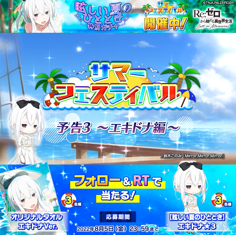 内容:『リゼロス』公式Twitter(https://twitter.com/re_zero_rezelos)をフォロー&キャンペーンツイートをRTすると、抽選で「オリジナルタオル エキドナVer.」を3名様に、「【眩しい夏のひととき】エキドナ★3」を3名様にプレゼントするキャンペーンを開催します。