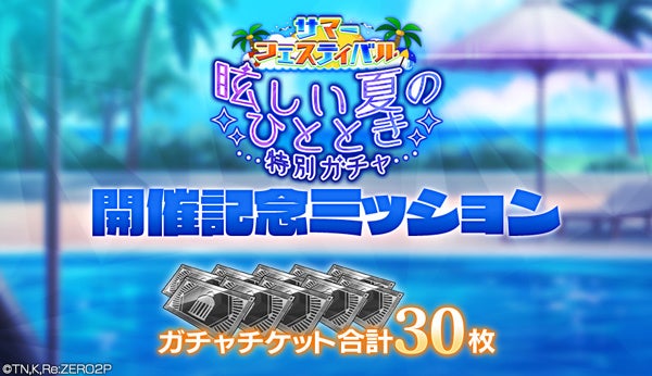 内容: サマーフェスティバル特別ガチャの開催を記念して、「【眩しい夏のひととき】ガチャチケット」最大30枚が手に入るミッションを開催します。