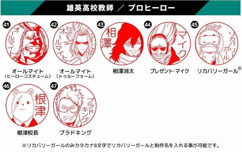 選べるキャラクターのイラストはこちらの47種類。ヒーローになることを夢見る主人公の緑谷出久(通称:デク)やデクの幼馴染みの爆豪勝己(ばくごうかつき)・麗日お茶子(うららかおちゃこ)・轟焦凍(とどろきしょうと)など雄英高校のヒーロー科・1年A組の生徒たちや、物間寧人(ものまねいと)・拳藤一佳(けんどういつか)・鉄哲徹鐵(てつてつてつてつ)といった1年B組の生徒たちに加え、雄英高校の教師であるオールマイトや相澤消太(あいざわしょうた)といったヒロアカ好きにはたまらないキャラクターがせいぞろい。