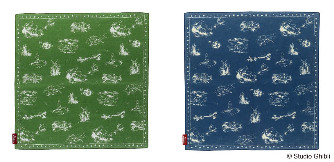 バンダナは日本の伝統色をイメージした深緑色の松葉と深みのある青色の鉄紺と、全2種の展開です。バンダナのふちにはもののけたちの足跡がプリントされ、もののけたちを感じられるようなデザインです。