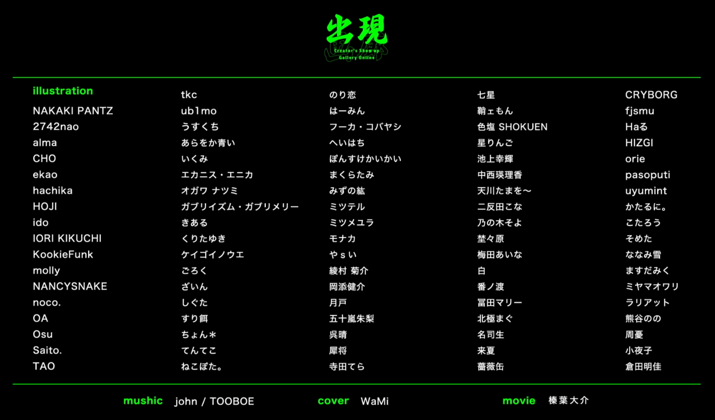 人気ボカロPの「john / TOOBOE」が作詞作曲を手がけたテーマソング『出現』のミュージックビデオは、毎回選抜されたアーティストの代表作が掲載されることが好例になっています。今回のMVを手掛けるのは「水曜日のダウンタウン」のオープニング映像などで知られる榛葉大介。さらに、次世代アーティストのWaMiがカバーを担当しました。